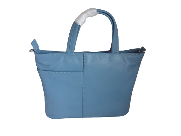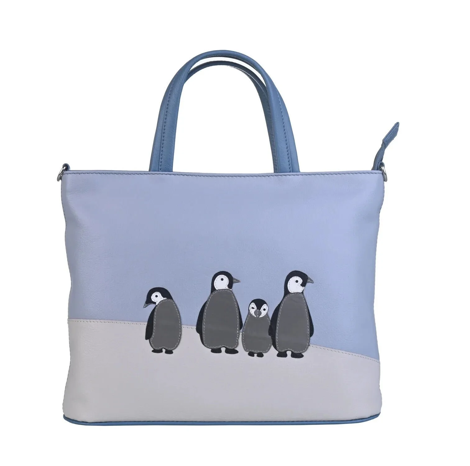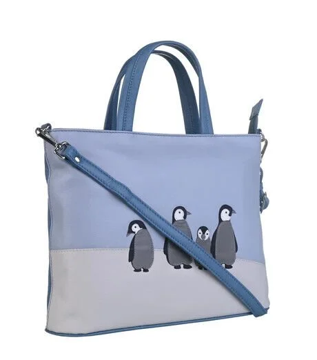 The main body of the bag is made of genuine soft leather in a cool blue colour. The front features an appliqué design of Ollie the Penguin and his friends.