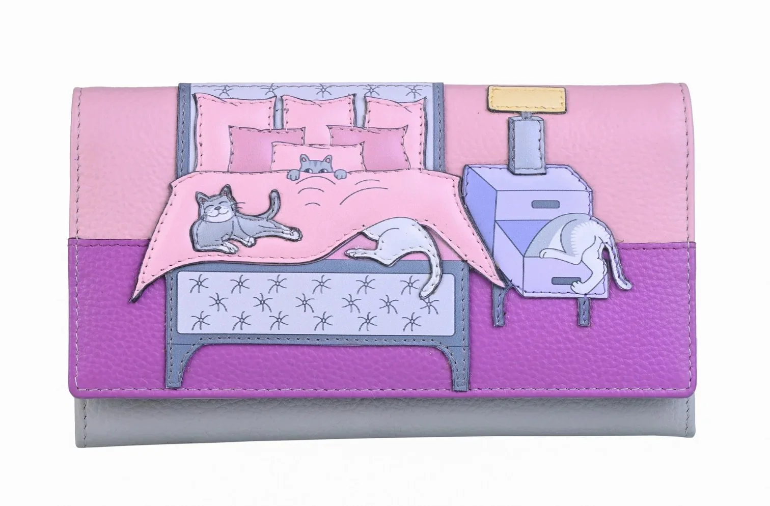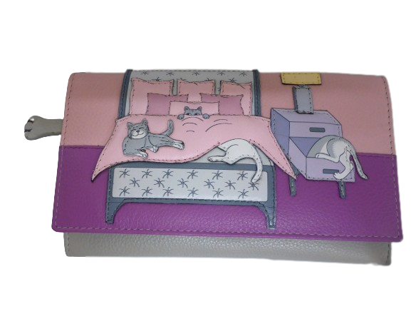 The main body of the purse is made of genuine soft leather in a light grey colour. The front features an applique design from Mala's Leather Cat Nap Range. Features a pink bedroom scene, with a bed and multiple cats detail.